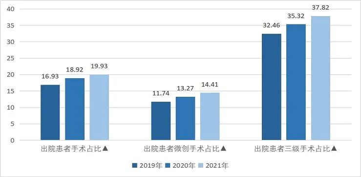 (一)临床服务能力持续提升。一是诊疗范围稳步扩展。2021年,全国二级公立医院收治住院患者中,以心脑血管疾病和呼吸系统疾病中的常见多发疾病患者为主,符合二级公立医院功能定位。同时,二级公立医院诊疗病种覆盖范围逐年增加,2021年二级公立医院DRG组数中位数为400组,较2020年增加8组;其中,综合医院DRG组数中位数440组,较2020年增加11组。兵团和云南、山东等省份二级公立医院的DRG组数位于全国前列,贵州、河北、湖南等省份平均DRG组数增长速度相对较快。二是技术难度持续提升。2021年,全国二级公立医院出院患者手术占比、三级手术占比分别为19.93%和37.82%(见图2),较2020年分别提升1.01个、2.50个百分点,呈逐年递增趋势,部分二级公立医院逐步开展了具有一定难度的手术。全国二级公立医院反映疾病复杂程度的病例组合指数(CMI值)达到1.04,相较2020年提高0.03。其中,北京、上海、浙江二级公立医院的CMI值稳居全国前3位,广西、贵州等省份的CMI值提升幅度较大。三是服务模式创新发展。2021年,全国二级公立医院微创手术占比达到14.41%,相较2020年提升1.14个百分点(见图2),在提升疾病综合诊疗水平和患者医疗服务舒适性方面作出积极探索,腹腔镜和胸腔镜下操作等微创手术在更多医院得到应用。此外,全国二级公立医院低风险组病例死亡率为0.03%,较2020年略有下降。