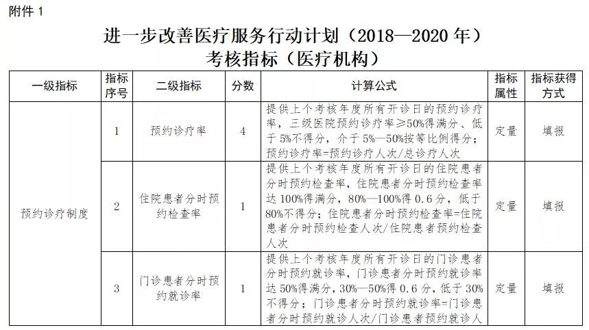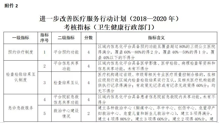 近日,国家卫生健康委员会发布《关于印发进一步改善医疗服务行动计划(2018—2020年)考核指标的通知》,以期指导各地做好改善医疗服务效果评估考核工作。据悉,考核指标主要围绕改善医疗服务新三年重点任务制定,其中,针对医疗机构的考核指标总分数为100分,针对卫生健康行政部门的考核分数为50分。