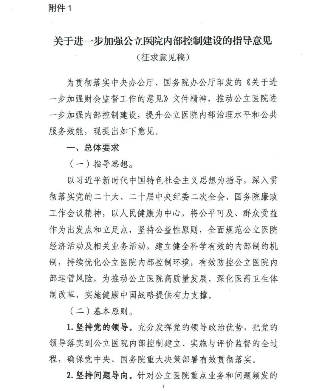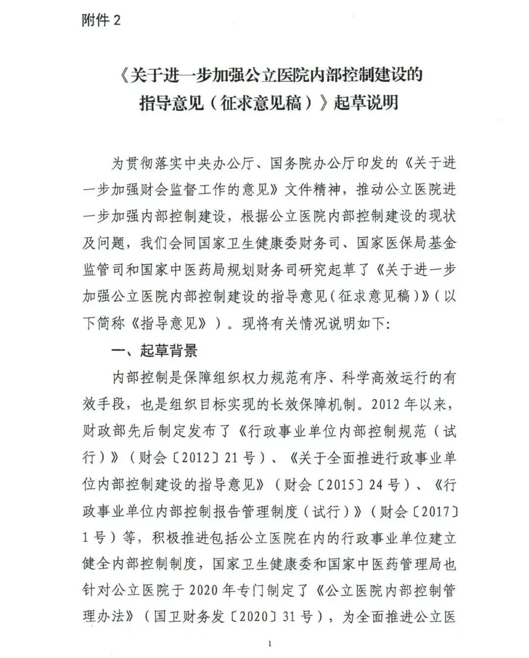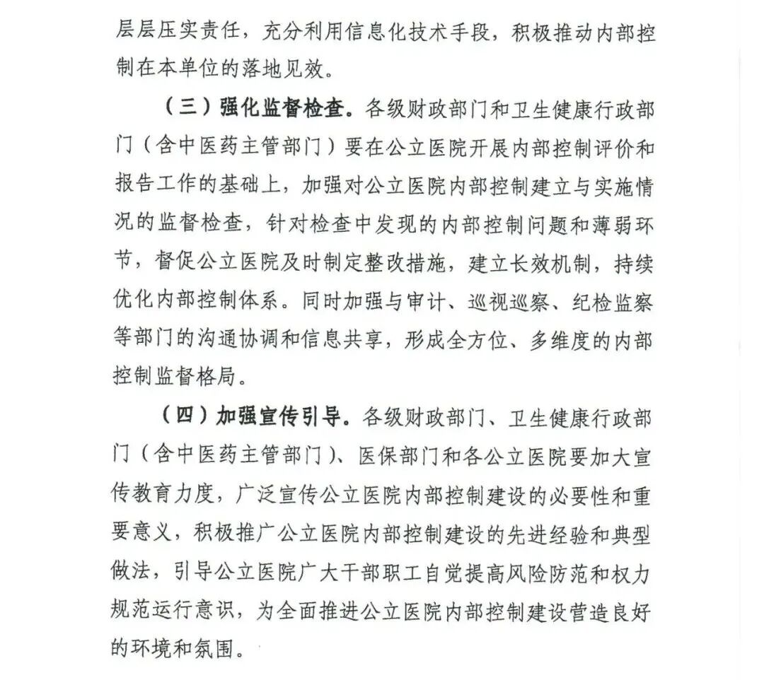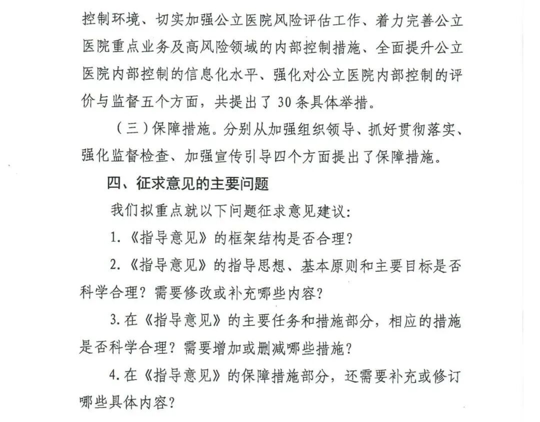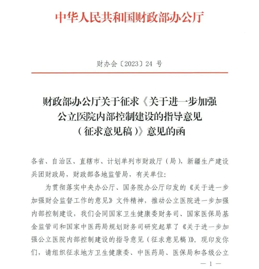 近日,财政部公布《关于进一步加强公立医院内部控制建设的指导意见(征求意见稿)》,以推动公立医院加强内部控制建设,合理保证公立医院经济活动合法合规、资产安全和使用有效、财务信息真实完整,有效防范舞弊和预防腐败,提高资源配置和使用效益。